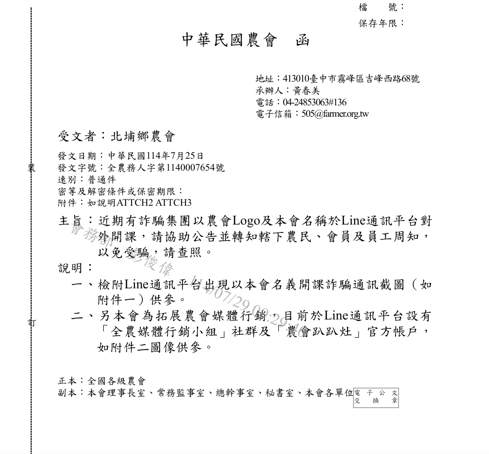 會務_近期有詐騙集團以農會Logo及名稱於Line對外開課,請農民會員周知,以免受騙_1140729