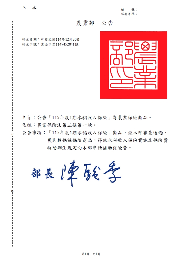 保險_公告『115年度1期水稻收入保險』為農業保險商品1141231